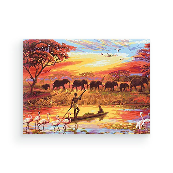 Laat je meevoeren naar de prachtige savannes van Afrika met het Schilderen op Nummer - Afrikaans Landschap pakket. Dit schilderij toont een betoverend tafereel van een warme zonsondergang en silhouetten van wilde dieren, perfect voor zowel beginners als gevorderden.