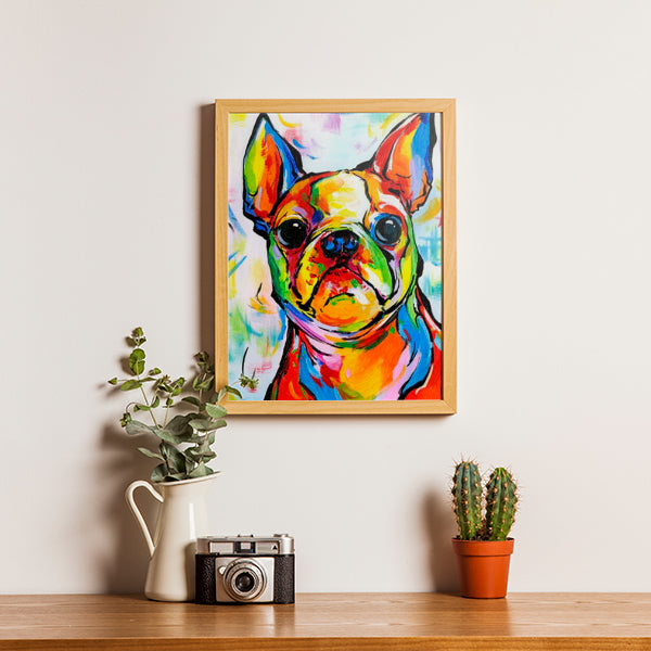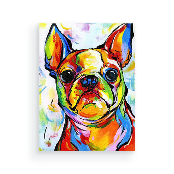 De Franse buldog is een kleine stevige en gespierde hond. Kenmerkend zijn de redelijk platte en brede neus en de rechtop staande oren. Met dit schilderen op nummers doek zie je een Franse bulldog met mooie vrolijke kleuren. De oren, ogen en neus zijn erg kenmerkend en goed te schilderen. Op het achtergrond zie je dat de kleuren van de hond verder doorgewerkt wordt. Een leuk paint by number project voor urenlang schilderplezier en ontspanning. Durf jij dit project aan?