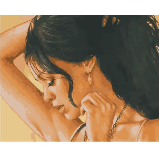 Een mooie vrouw met donkerhaar die poseert als een echte model. Het schilderen van mensen is één van de moeilijkste dingen die er zijn maar nu ook beschikbaar in paint by nummers vorm. Hierdoor is een stukje eenvoudiger geworden om een realistische vrouw te kunnen schilderen. Dit mooie schilderij is nu verkrijgbaar voor maar € 14,95 en zorgt voor urenlange schilderplezier. Durf jij dit project aan?