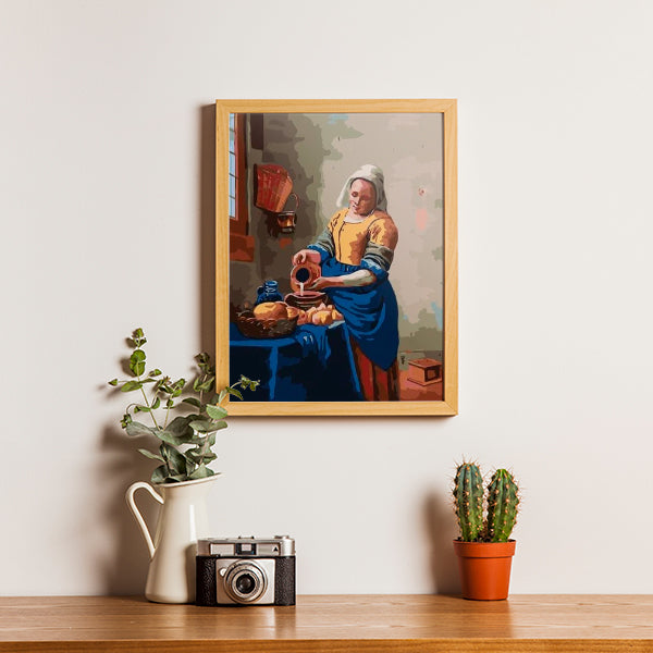 Het melkmeisje van de Hollandse schilder Johannes Vermeer is geschilderd in 1660. Dit is één van de meest bekende schilderijen ter wereld en is nu ook zelf te schilderen op een schilderen op nummers doek. De benaming Het melkmeisje is feitelijk onjuist omdat een melkmeisje een vrouw was die melk aan huis bezorgde; de hier afgebeelde vrouw is een keukenmeid. Ze is als zodanig te herkennen vanwege haar eenvoudige kleding en gestreken hoofdkapje. Ze staat in het midden van de afbeelding, in een kamer met aan de linkerzijde een venster, waardoor het licht binnenvalt. Voor haar, aan de linkerzijde en onder het venster, bevindt zich een tafel, bedekt met een kleed, waarop een mand met brood, een kan, en andere waren staan. De meid schenkt melk vanuit een kruik in een schaal die ook op tafel staat; haar aandacht is gericht op het schenken.