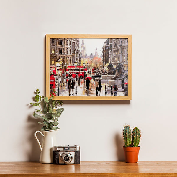 Trafalgar Square is samen met Piccadilly Circus en Leicester Square één van de bekendste pleinen van Londen. Het is vernoemd naar de slag bij Trafalgar van 1805 waarbij Horatio Nelson een Spaanse-Franse vloot van Napoleon versloeg. Dit was een belangrijke overwinning op Napoleon, hierdoor kon het Verenigd Koninkrijk voor vele jaren zijn heerschappij over de zeeën vestigen. Op het schilderen op nummers doek zie je twee bronzen leeuwen ontworpen door Edwin Landseer en op het plein zie je de bekende Britse dubbeldekkers. Ook zie je veel mensen met paraplu's lopen in echte Britse weersomstandigheden. Ben je weleens in Londen geweest? Dan herken je dit plein direct. Wil je dit plein schilderen met een paint by numbers doek, dan is dit je kans!
