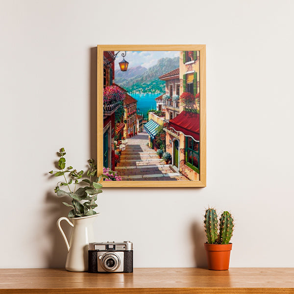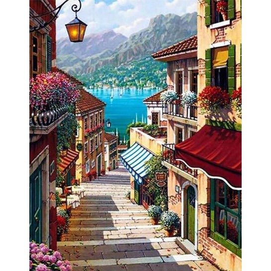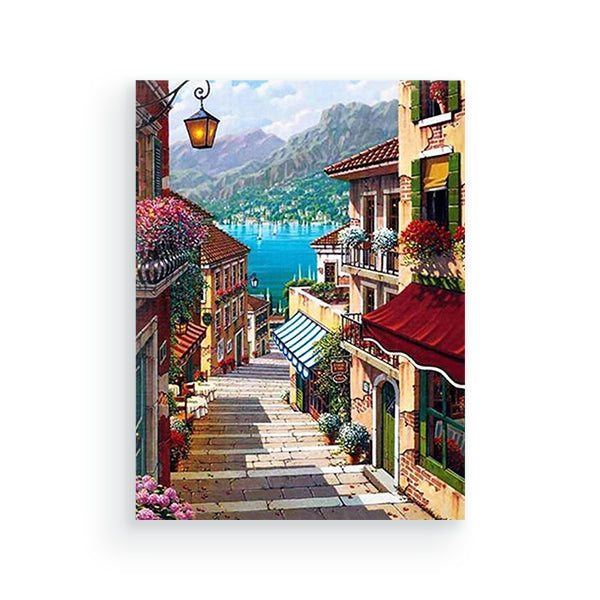 Dit doek geeft trap weer met op de achtergrond een meer met bergen. De trappen vind je veel in de zuidelijke landen en worden vaak door de grote traptreden ook luie trappen genoemd. Op de zomerse avonden flaneren de dames en heren hier graag heen weer naar de boulevard om een briesje wind van zee op te vangen. Dit doek heeft een moeilijkheidsgraad van 2 sterren en valt daardoor in de categorie beginnersdoeken. Door de mooie kleuren is het fijn om het doek te schilderen. Ga jij de uitdaging aan om het doek te schilderen?