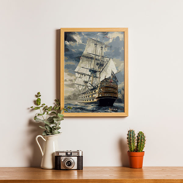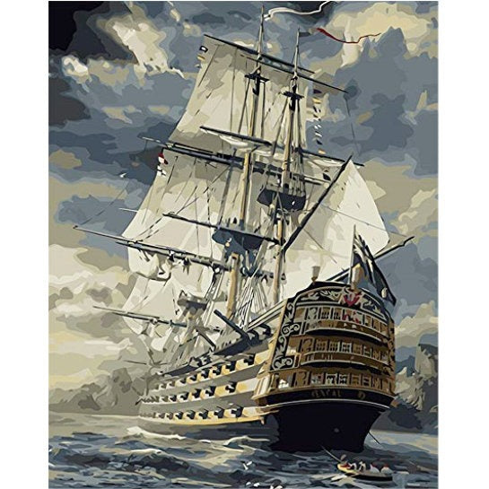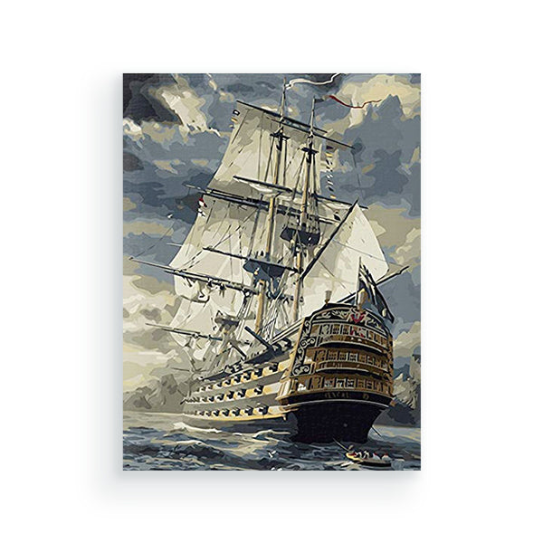 Deze oude vloot uit de 17e eeuw laat veel zien. De luiken voor de kanonnen staan open en je ziet de kanonnen al klaar staan. Voor op het schip zie je het boegbeeld en volgens de volksmond belichaamden boegbeelden de geest van het schip. De boegbeelden zijn altijd vrouwelijk en werd altijd geplaatst op het galjoen of het scheg. Op de voorgrond zie je een kleine sloep met 4 a 5 personen. Het doek met de vloot is een mooi en heftig schilderij. Door de zwaardere kleuren geeft hij het zware weer opkomst en de woeste zee aan. Het schilderij valt in de moeilijkheidscategorie drie sterren. Ga jij de uitdaging aan om het doek volledig te schilderen?